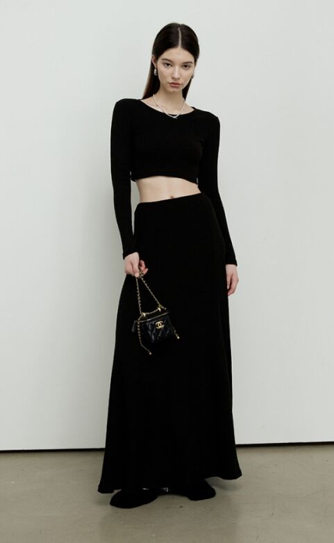 Black, women's long skirt set, low round neck long sleeved top, exposed belly button, large swing long skirt