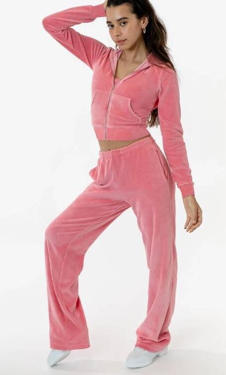 Pink, women's velvet casual jumpsuit, long sleeved top with open chest zipper, loose pants