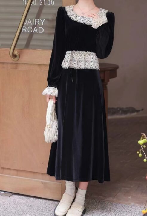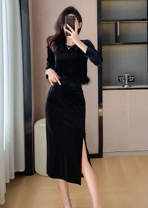 Black, women's velvet suit, long sleeved shirt with a straight neckline, black plush decoration on the hem, and painted long skirt on the lower body