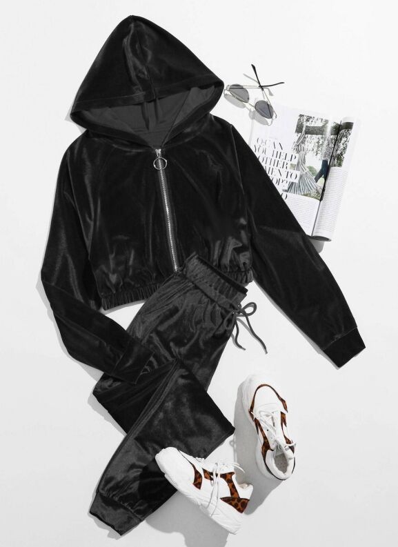 Black, women's velvet suit, long sleeved zipper top, long pants with hem closure