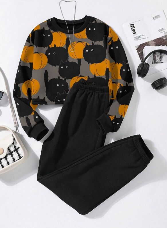 Women's two-piece set, includes Halloween themed cat and pumpkin print sports top and jogging pants...