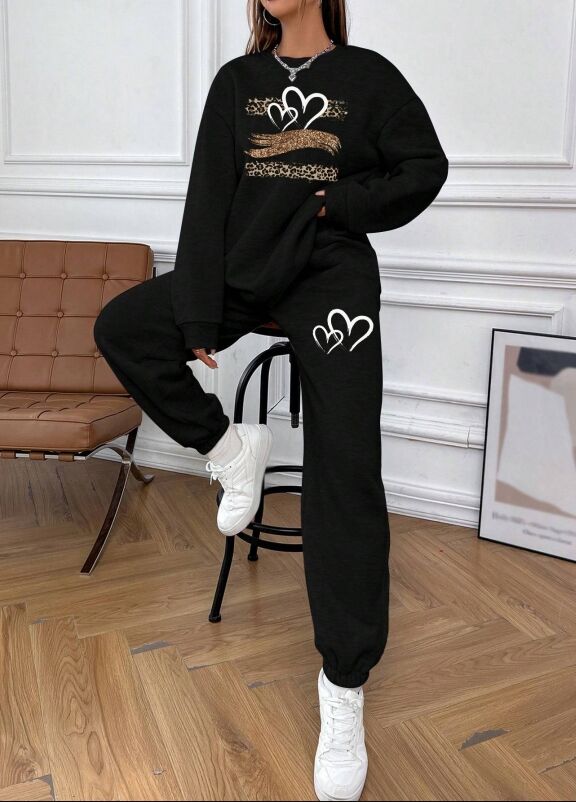 Black, women's hoodie set, long sleeved pants, round neck, front chest of top, 2 heart-shaped patterns printed on top of left leg