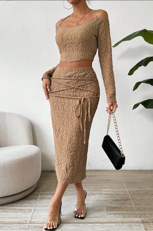 Khaki color, women's knitted suit, top with camisole and long sleeves, over painted hip skirt, paired with ribbon wrapped around the waist