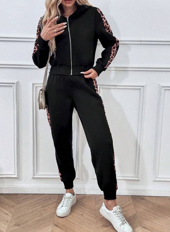Black, women's hoodie set, hooded sweatshirt, long sleeved pants with leopard print pattern on the outer side of the sleeves and legs