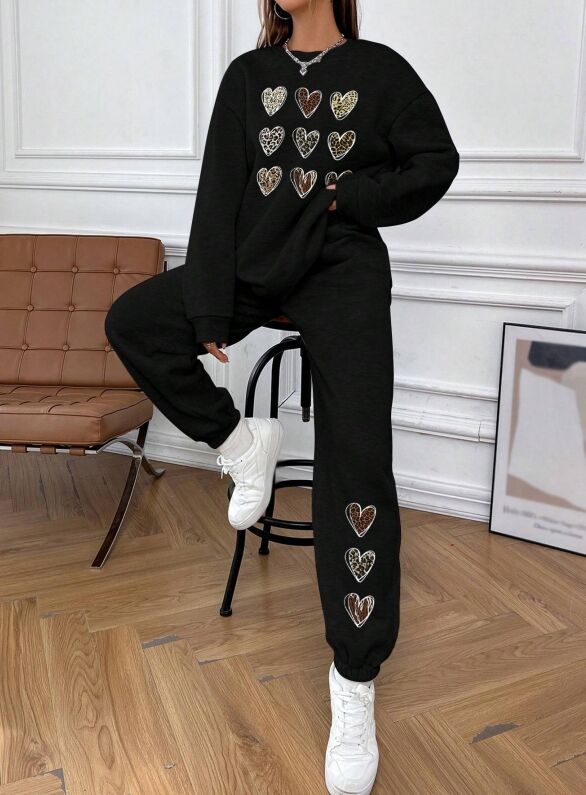 Black, women's hoodie set, long sleeved pants, round neck, with 9 hearts on the chest of the top and 3 heart patterns on the left leg