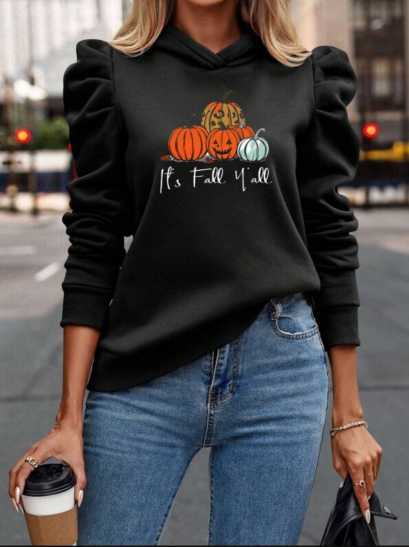 Black, women's hoodie, hooded top, long sleeves, bubble sleeves
