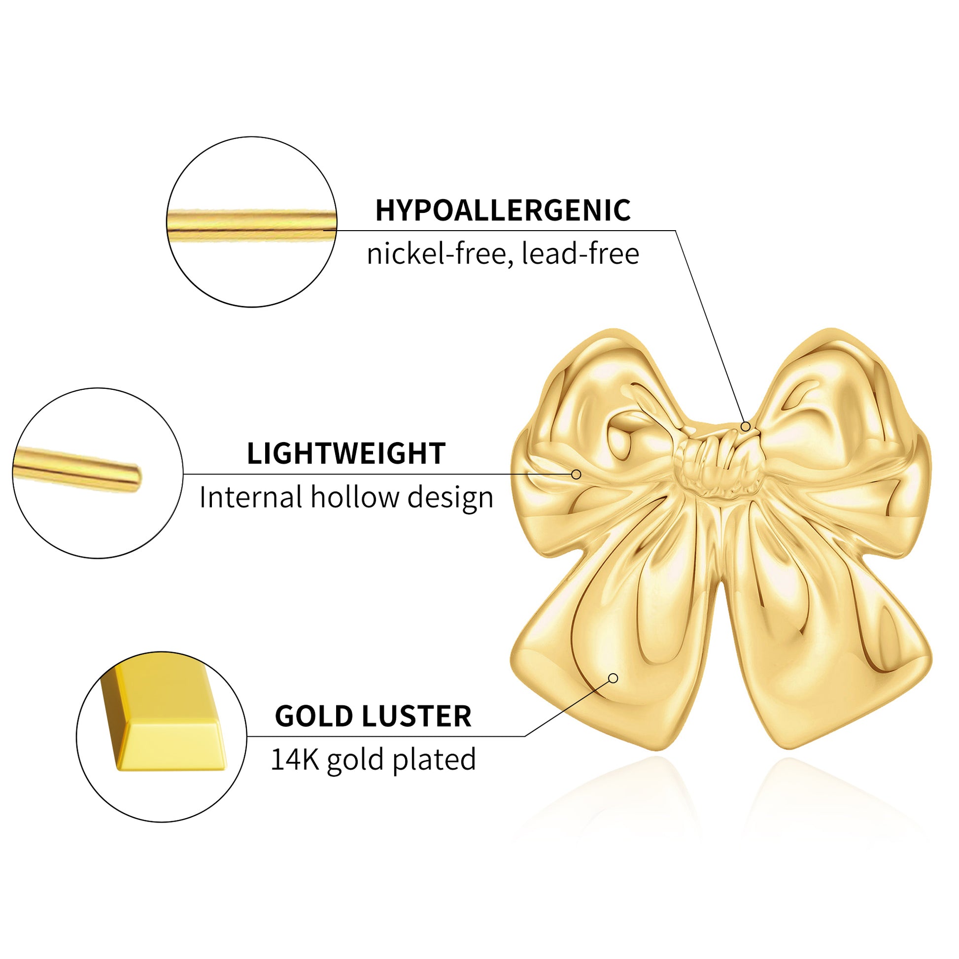 Comfortable material: this lady's thick golden bow earrings are made of copper and plated with golden, which will not damage your ears. Bow pendant earrings are suitable for sensitive ears and will not fall off and lose color. High-quality stunning polishing, no scratches, no nickel, no lead and low allergenicity.