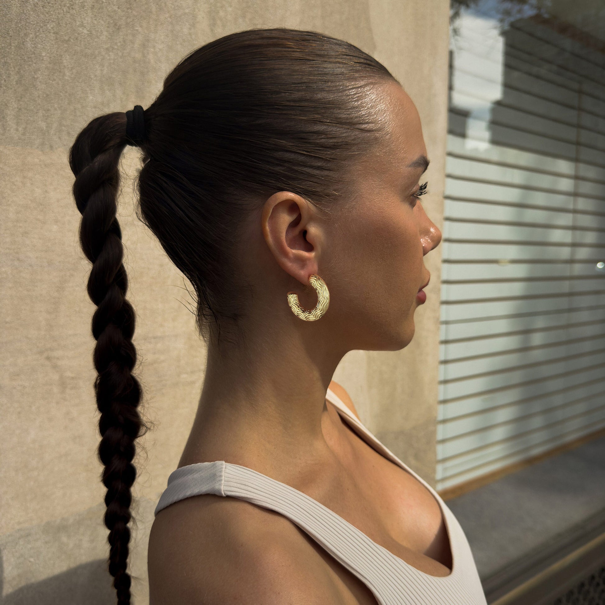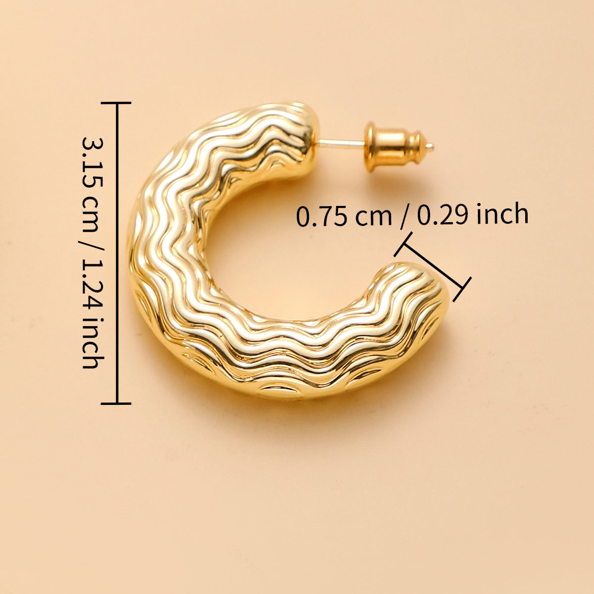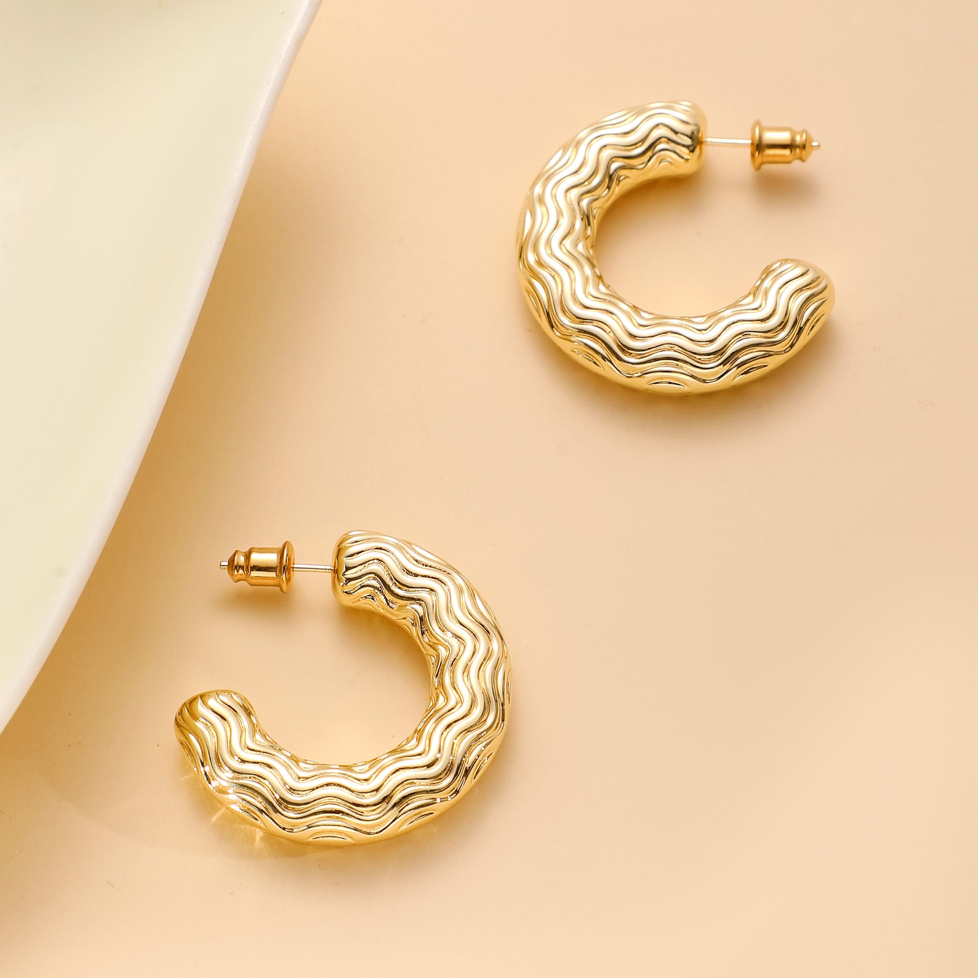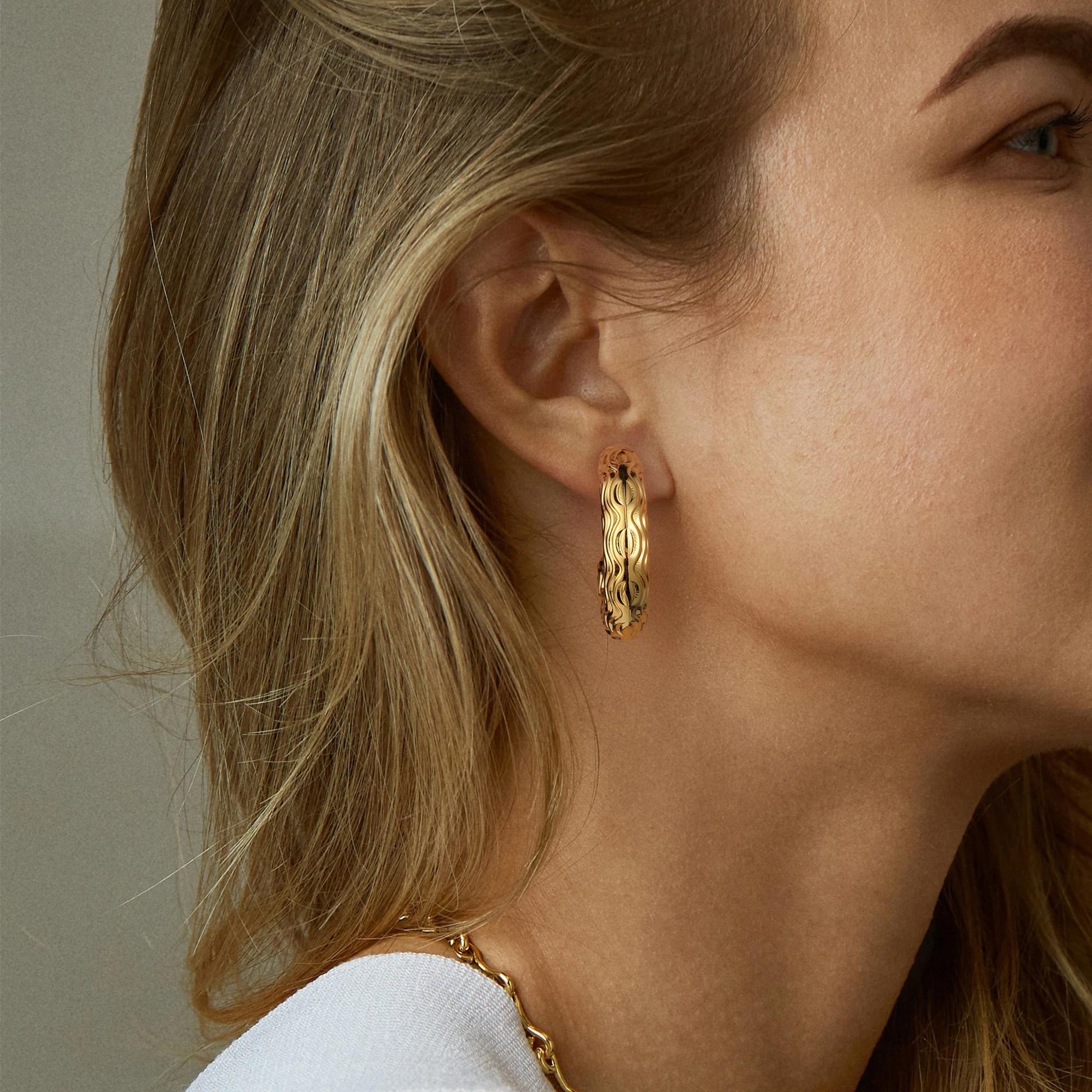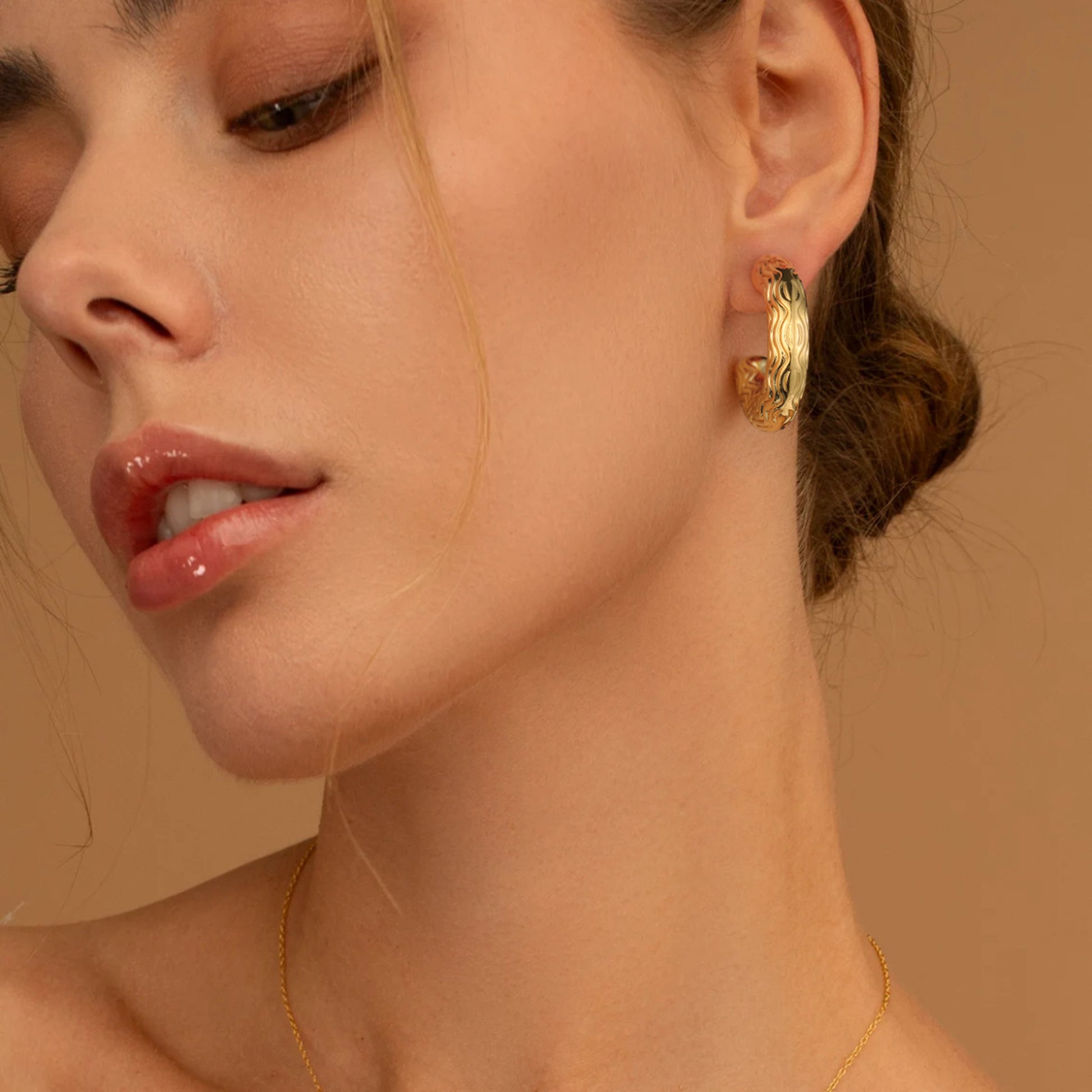 Golden-colored C-shaped earrings with various patterns