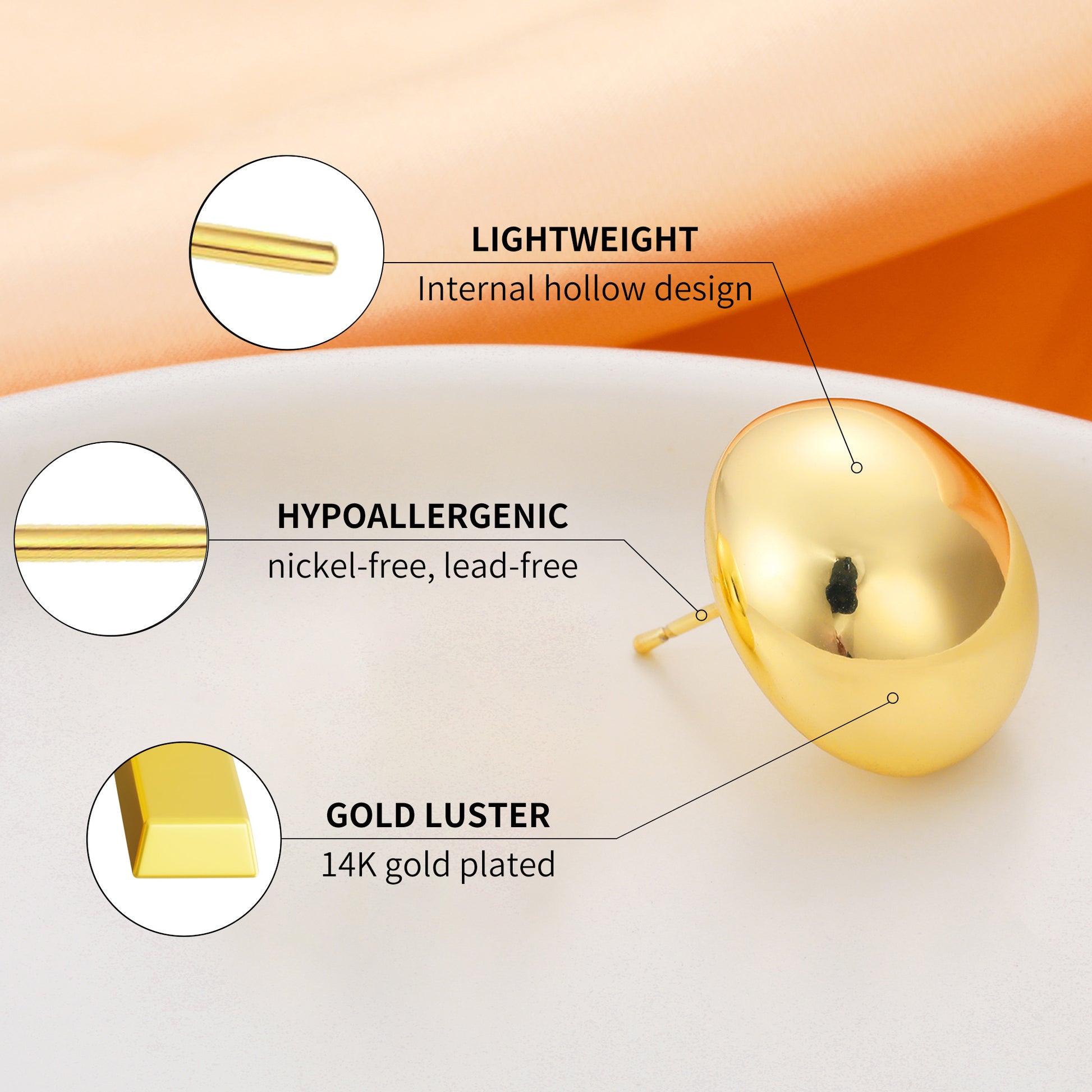 Hypoallergenic Earrings: This thick golden earring is made of 14K golden-plated brass, which is hypoallergenic, lead-free and nickel-free, comfortable for sensitive ears, and will not peel off and fade.
