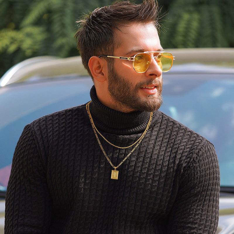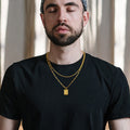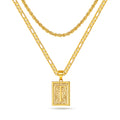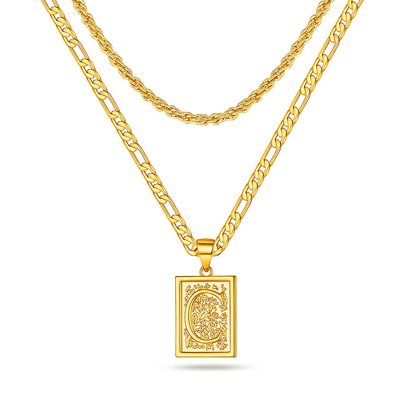Golden, three to one rope double layered chain, rectangular capital gold letter tag pendant necklace