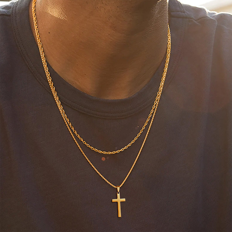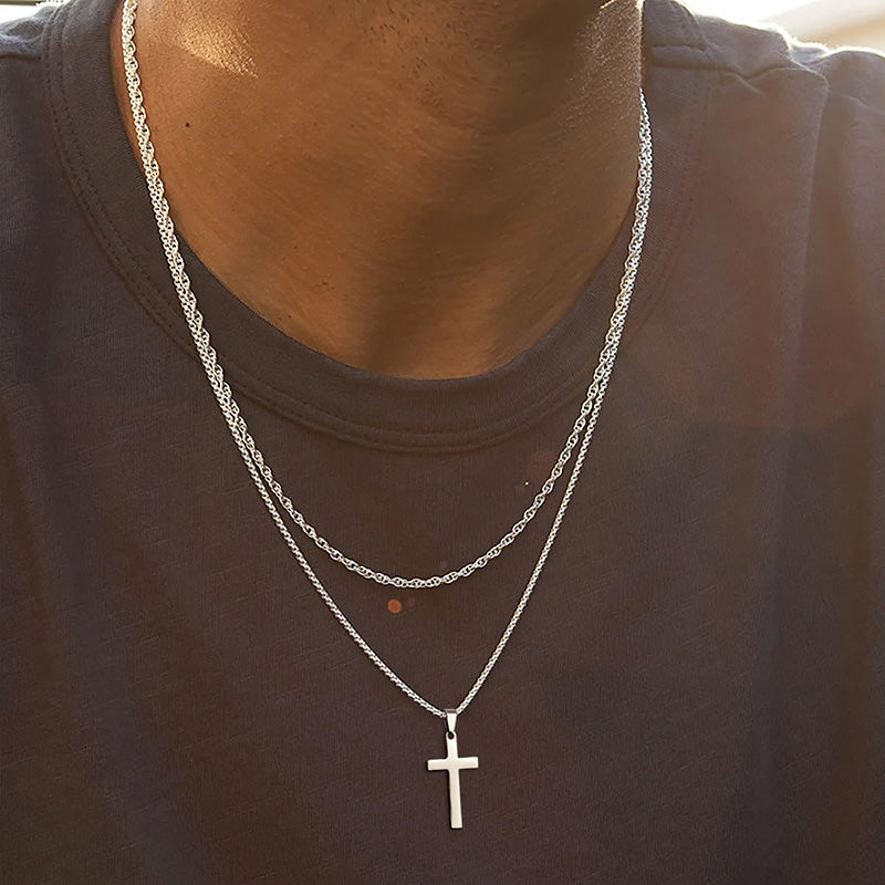 Silvery/Black/Golden, woven rope style chain, stainless steel melon seed buckle cross double-layer chain, style A2- rope and box hole